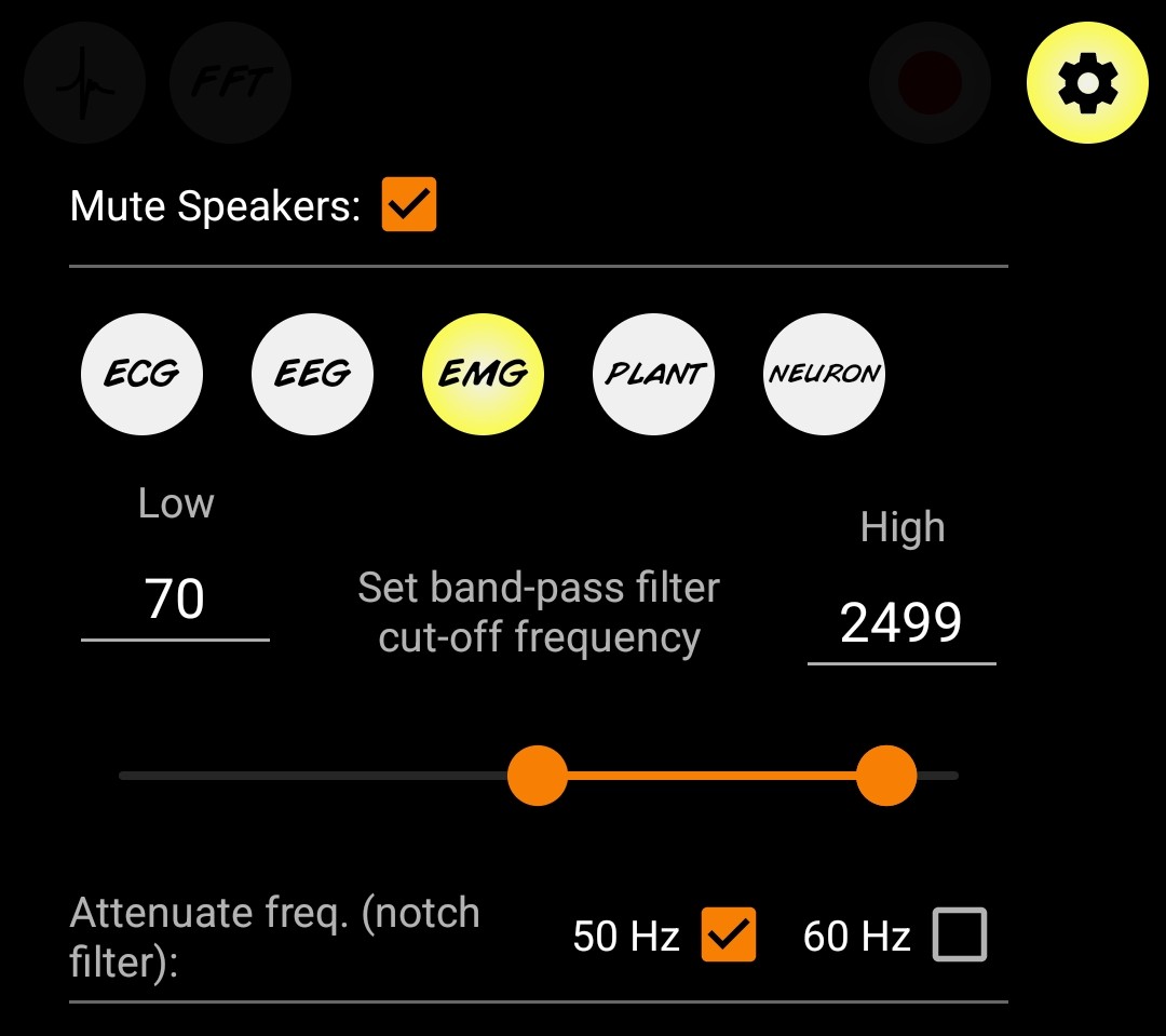 Buka aplikasi, klik ikon pengaturan di sudut kanan atas dan atur jenis perekaman ke EMG.